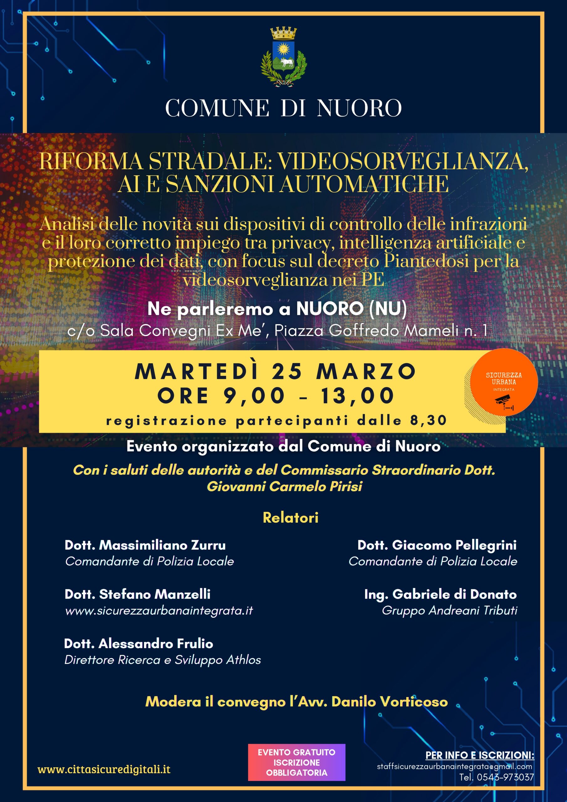 Athlos è orgogliosa di annunciare la partecipazione del nostro Direttore della Ricerca e Sviluppo, il Dott. Alessandro Frulio, al convegno RIFORMA STRADALE: VIDEOSORVEGLIANZA, AI E SANZIONI AUTOMATICHE. L’evento, organizzato dal Comune di Nuoro, si terrà martedì 25 marzo dalle ore 9:00 alle ore 13:00 nella Sala convegni Ex Me’ di Piazza Goffredo Mameli n.1.